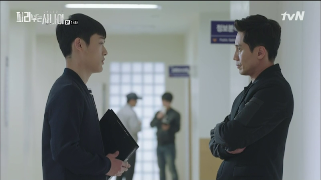 He means Hee-sung, of course. And indeed, why? Who is this guy?! He then asks Sergeant Jo what to do if you have a suspect you're 100% sure is the perpetrator, but there's no evidence? Follow him 24/7, is the answer. Of course, the "follow him 24/7" is right up Sung-chan's alley: bite and do not let go. He does that best.