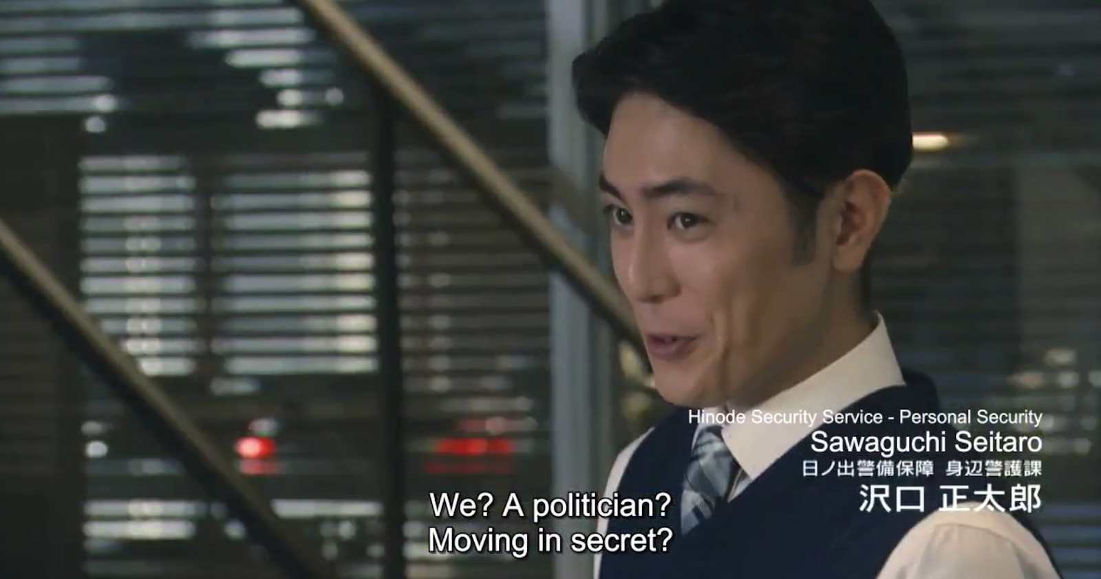 Lookee here. It’s PM Tachiahara and their boss, the president of Shinode Security. This is where we ended the previous episode. She dismisses her secretary (who leaves reluctantly), and their boss tells them about their new assignment. PM Tachihara is having a secret meeting that she can’t tell the SP about. Murata does not like this assignment and Shimazaki looks suspicious, too. (but really, who wouldn’t? This woman is completely sketchy, Kakashi).